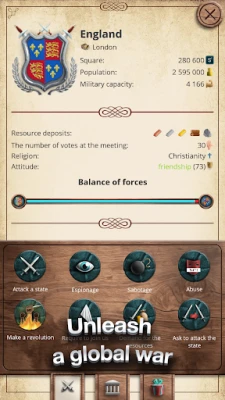 ஒரு பெரிய பேரரசை வழிநடத்தி, உங்கள் படைகளுக்குக் கட்டளையிடுங்கள். வீரர்களுடன் போர்க்களத்திற்குத் தலைமை தாங்கி வெற்றிகளைப் பெறுங்கள். வலிமையான பொருளாதாரத்தை உருவாக்கி, இராஜதந்திர விளையாட்டுகளில் ஈடுபடுங்கள். சர்வதேச அரங்கில் ஒரு செயலூக்கமான வீரராக மாறி, உலக வரலாற்றின் மிகப்பெரிய நாகரிகமாகப் போராடுங்கள்.